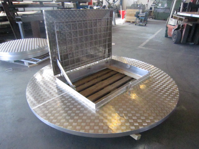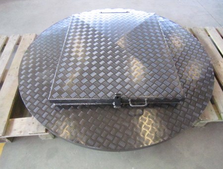 På denne model fastmonteres dækket med lasker indvendigt eller huller i skørt udvendigt på brønden, som kan være fra Ø1000mm til Ø3500mm. Mandehullet laves som standard 1000x1000mm med et låg, men det er dog også muligt at 2-dele det eller lave flere mandehulller, såfremt brønden er stor nok. Låget til mandehullet kommer som standard med hængsel, håndtag og låsebeslag. Hele dækslet fremstilles i søvandsbestandigt aluminium.