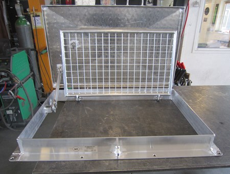 Sikkerhedsrist hængslet ved låg leveres bl.a. til firkantede dæksler, runde dæksler med karm og dæksler med fast del eller mandehul. Sådan en rist kan fremstilles i galvaniseret, rustfri AISI304 og syrefast rustfri AISI316 stål. Den kan fastholdes i åben position med krog. Overstiger løftekraften 15 kg er det som regel muligt at montere gasdæmpere.